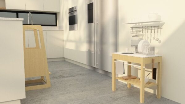 Add real elements: a source of water that the child can get by itself when he/she is thirsty. It is also advisable to add real items: plates, cutlery suitable for children, juicer, bowls, napkins, cutting board. Near the kitchen, it is recommended to place the cleaning kit for children so they can access to it freely.